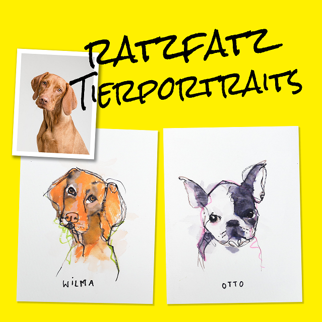 Zudem werden am Sonntag Live-Tierportraits gezeichnet. Entweder von Eurem Liebling vor Ort oder Ihr bringt ein Foto mit. Die Portraits entstehen Ratzfatz - also in ca. 5 Minuten und werden auf A5 oder A6 Größe mit Aquarellstiften gezeichnet.