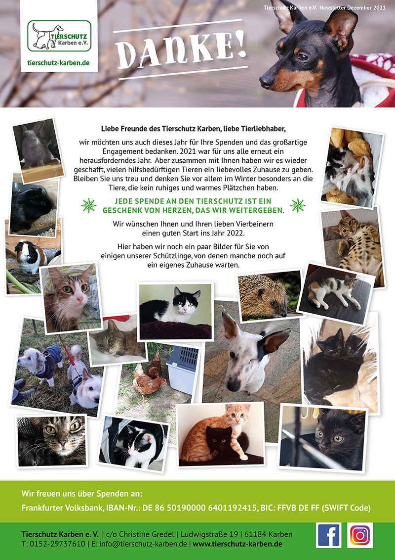 wir möchten uns auch dieses Jahr für Ihre Spenden und das großartige Engagement bedanken. Mit jeder Spende an den Tierschutz erzielen wir Erfolge zum Wohle der Tiere. Nach langer Coronapause haben wir in diesem Jahr wieder an Veranstaltungen teilgenommen und konnten so durch Ihre Spenden vielen hilfsbedürftigen Tieren helfen und ein liebevolles Zuhause zu geben.