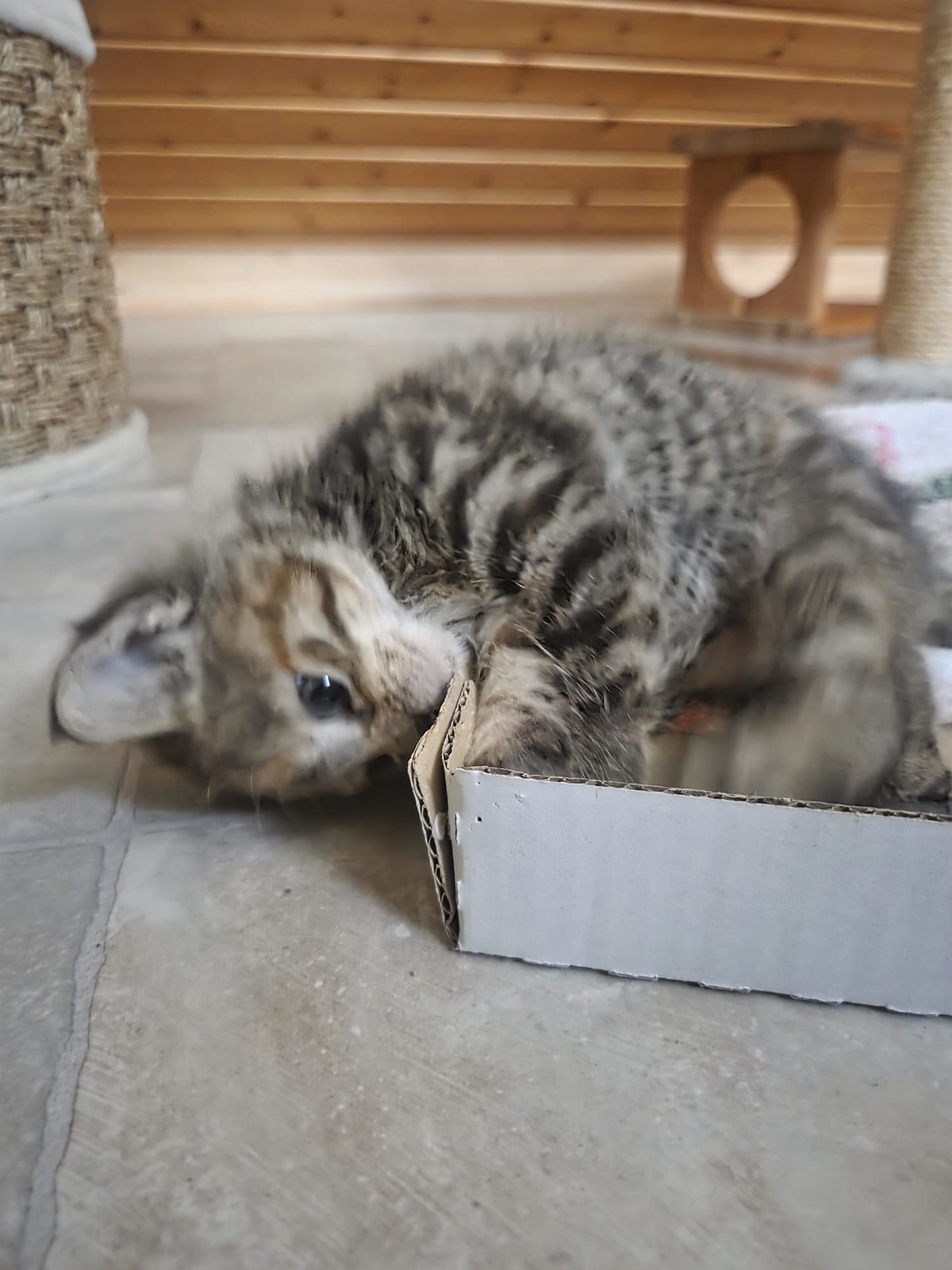 Wir haben es noch am gleichen Tag in der Tierklinik vorgestellt. Leider wurde bei der Untersuchung ein Schaden an der Wirbelsäule diagnostiziert, dadurch ist das linke Hinterbeinchen taub und Betzi, so haben wir die Kleine genannt, kann das Beinchen nur hinter sich herziehen. Aus diesem Grund wird eine Amputation des in Mitleidenschaft gezogenen Beines nicht zu vermeiden sein. Dadurch soll verhindert werden, dass körperliche Folgeschäden entstehen.